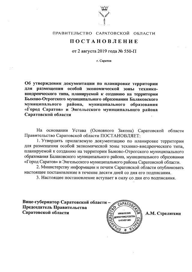 Постановление Правительства Саратовской области от 02.08.2019 N 550-П "Об утверждении документации по планировке территории для размещения особой экономической зоны технико-внедренческого типа, планируемой к созданию на территории Быково-Отрогского муниципального образования Балаковского муниципального района, муниципального образования "Город Саратов" и Энгельсского муниципального района Саратовской области"