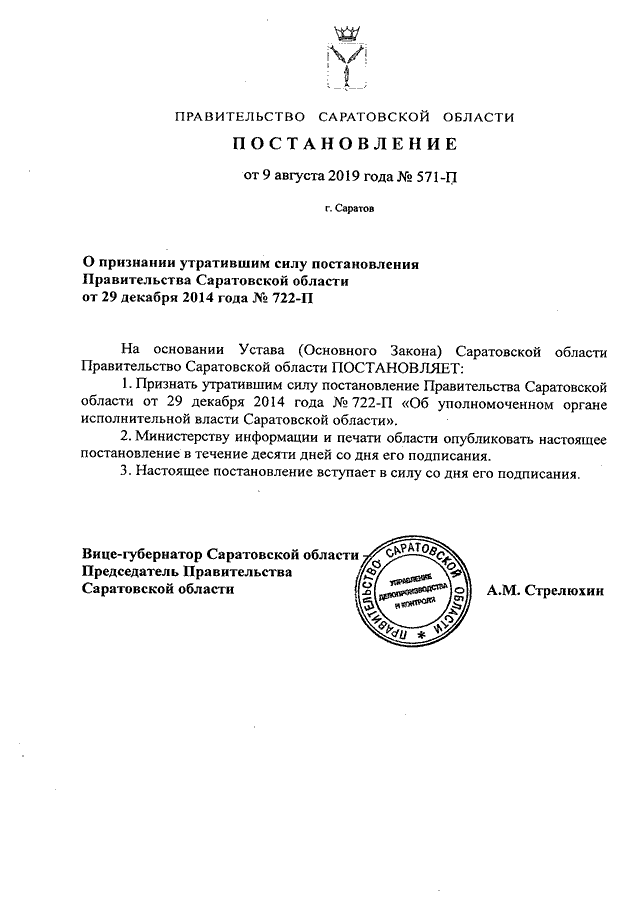 Постановление Правительства Саратовской области от 09.08.2019 N 571-П "О признании утратившим силу постановления Правительства Саратовской области от 29 декабря 2014 года N 722-П"