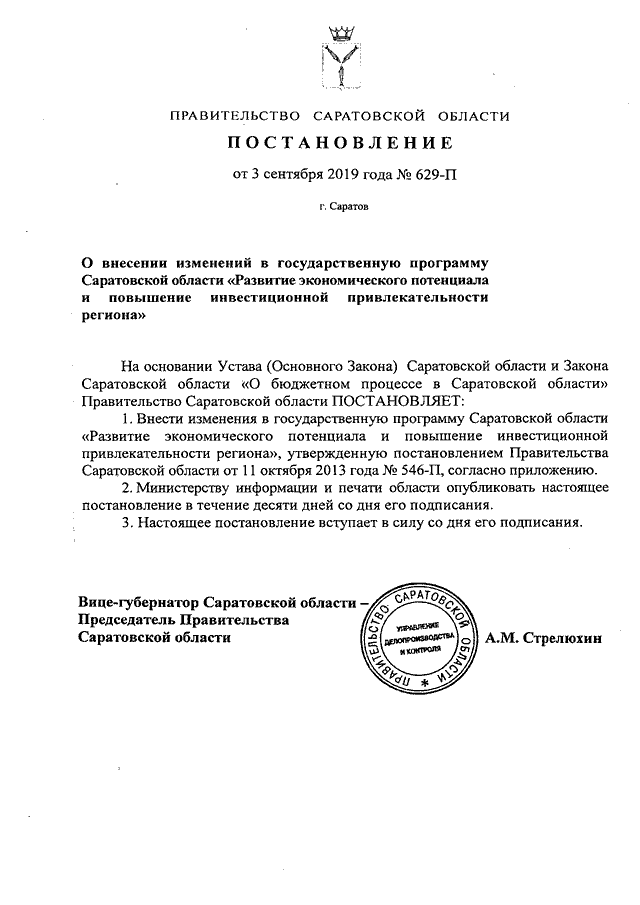 Постановление Правительства Саратовской области от 03.09.2019 N 629-П "О внесении изменений в государственную программу Саратовской области "Развитие экономического потенциала и повышение инвестиционной привлекательности региона"