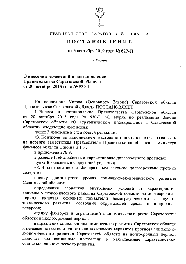 Постановление Правительства Саратовской области от 03.09.2019 N 627-П "О внесении изменений в постановление Правительства Саратовской области от 20 октября 2015 года N 530-П"