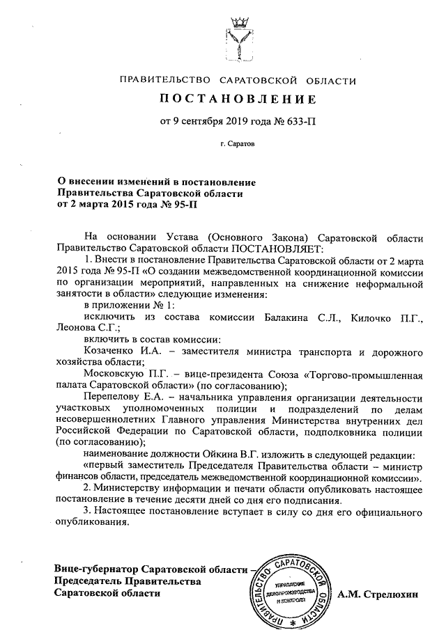 Постановление Правительства Саратовской области от 09.09.2019 N 633-П "О внесении изменений в постановление Правительства Саратовской области от 2 марта 2015 года N 95-П"