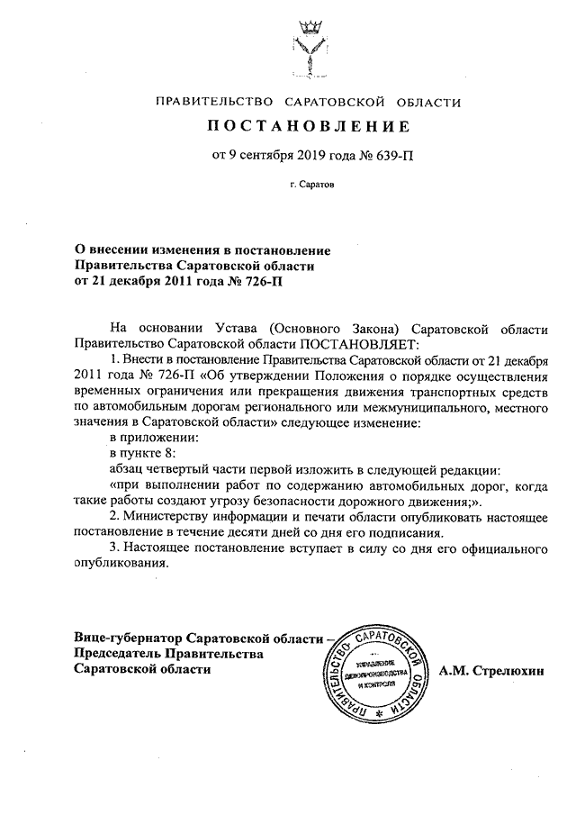 Постановление Правительства Саратовской области от 09.09.2019 N 639-П "О внесении изменения в постановление Правительства Саратовской области от 21 декабря 2011 года N 726-П"