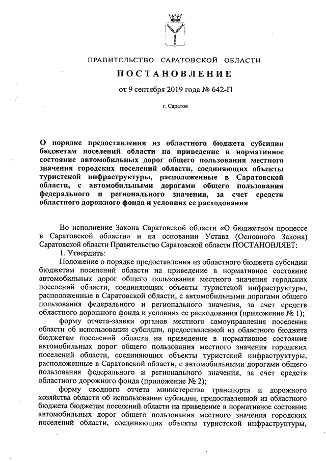 Постановление Правительства Саратовской области от 09.09.2019 N 642-П "О порядке предоставления из областного бюджета субсидии бюджетам поселений области на приведение в нормативное состояние автомобильных дорог общего пользования местного значения городских поселений области, соединяющих объекты туристской инфраструктуры, расположенные в Саратовской области, с автомобильными дорогами общего пользования федерального и регионального значения, за счет средств областного дорожного фонда и условиях ее расходования" (вместе с "Положением о порядке предоставления из областного бюджета субсидии бюджетам поселений области на приведение в нормативное состояние автомобильных дорог общего пользования местного значения городских поселений области, соединяющих объекты туристской инфраструктуры, расположенные в Саратовской области, с автомобильными дорогами общего пользования федерального и регионального значения, за счет средств областного дорожного фонда и условиях ее расходования")