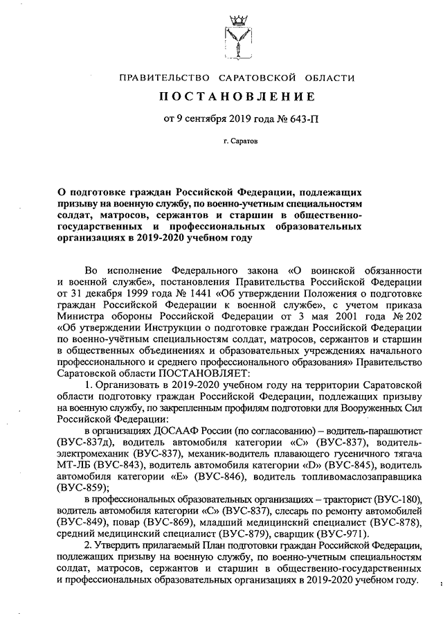 Постановление Правительства Саратовской области от 09.09.2019 N 643-П "О подготовке граждан Российской Федерации, подлежащих призыву на военную службу, по военно-учетным специальностям солдат, матросов, сержантов и старшин в общественно-государственных и профессиональных образовательных организациях в 2019 - 2020 учебном году" (вместе с "Планом подготовки граждан Российской Федерации, подлежащих призыву на военную службу, по военно-учетным специальностям солдат, матросов, сержантов и старшин в общественно-государственных и профессиональных образовательных организациях в 2019 - 2020 учебном году")