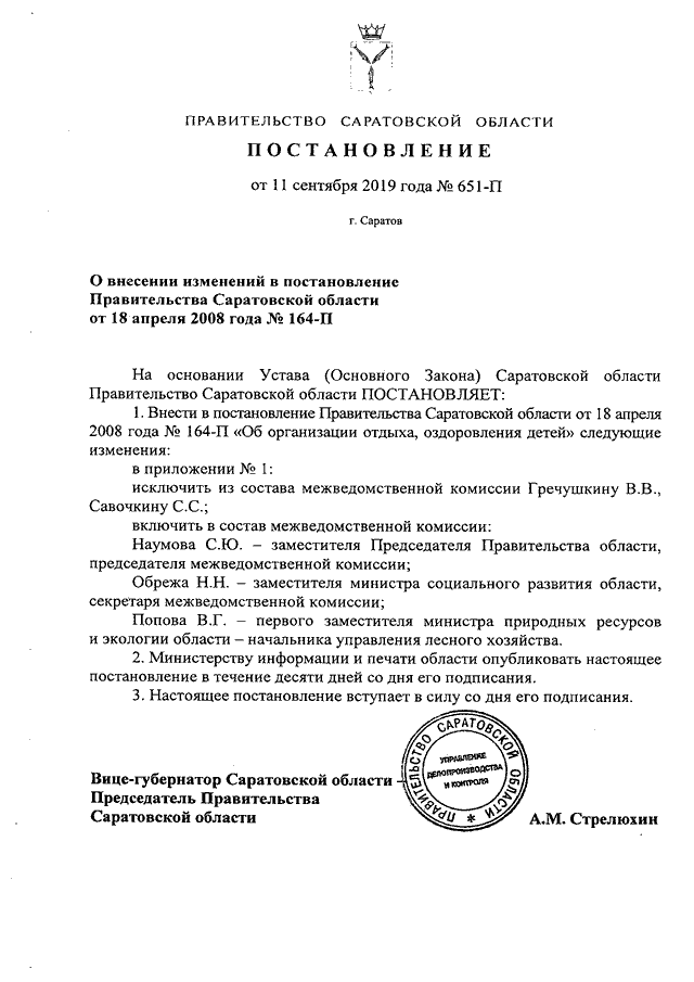 Постановление Правительства Саратовской области от 11.09.2019 N 651-П "О внесении изменений в постановление Правительства Саратовской области от 18 апреля 2008 года N 164-П"