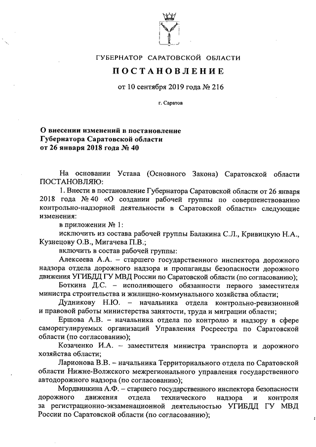 Постановление Губернатора Саратовской области от 10.09.2019 N 216 "О внесении изменений в постановление Губернатора Саратовской области от 26 января 2018 года N 40"