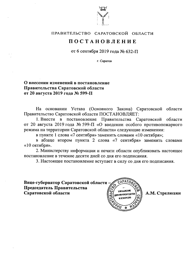 Постановление Правительства Саратовской области от 06.09.2019 N 632-П "О внесении изменений в постановление Правительства Саратовской области от 20 августа 2019 года N 599-П"