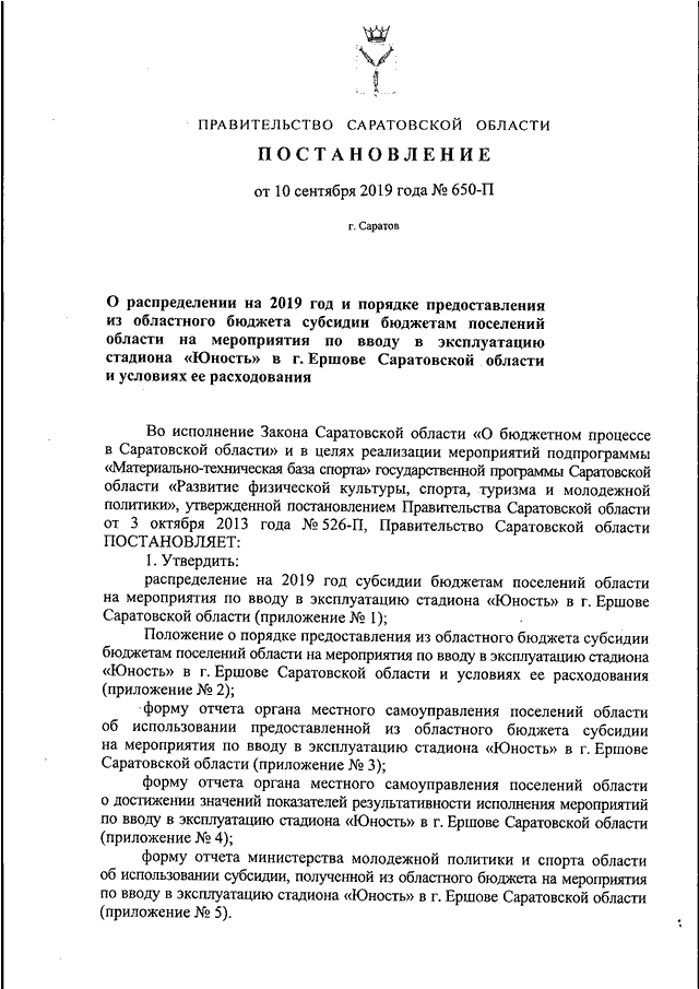 Постановление Правительства Саратовской области от 10.09.2019 N 650-П "О распределении на 2019 год и порядке предоставления из областного бюджета субсидии бюджетам поселений области на мероприятия по вводу в эксплуатацию стадиона "Юность" в г. Ершове Саратовской области и условиях ее расходования" (вместе с "Положением о порядке предоставления из областного бюджета субсидии бюджетам поселений области на мероприятия по вводу в эксплуатацию стадиона "Юность" в г. Ершове Саратовской области и условиях ее расходования")
