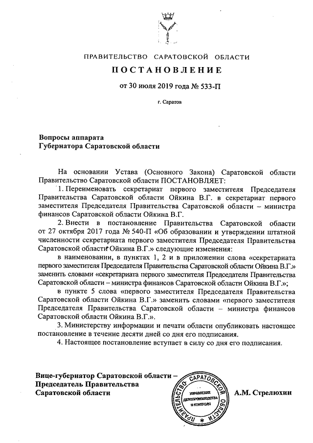 Постановление Правительства Саратовской области от 30.07.2019 N 533-П "Вопросы аппарата Губернатора Саратовской области"