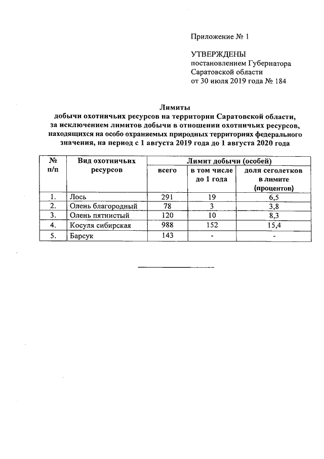 Постановление Губернатора Саратовской области от 30.07.2019 N 184 "Об утверждении лимитов и квот добычи охотничьих ресурсов на территории Саратовской области, за исключением лимитов и квот добычи в отношении охотничьих ресурсов, находящихся на особо охраняемых природных территориях федерального значения, на период с 1 августа 2019 года до 1 августа 2020 года"