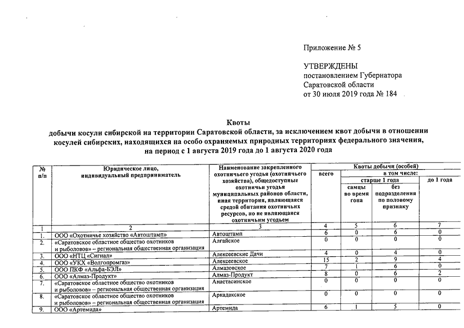 Постановление Губернатора Саратовской области от 30.07.2019 N 184 "Об утверждении лимитов и квот добычи охотничьих ресурсов на территории Саратовской области, за исключением лимитов и квот добычи в отношении охотничьих ресурсов, находящихся на особо охраняемых природных территориях федерального значения, на период с 1 августа 2019 года до 1 августа 2020 года"