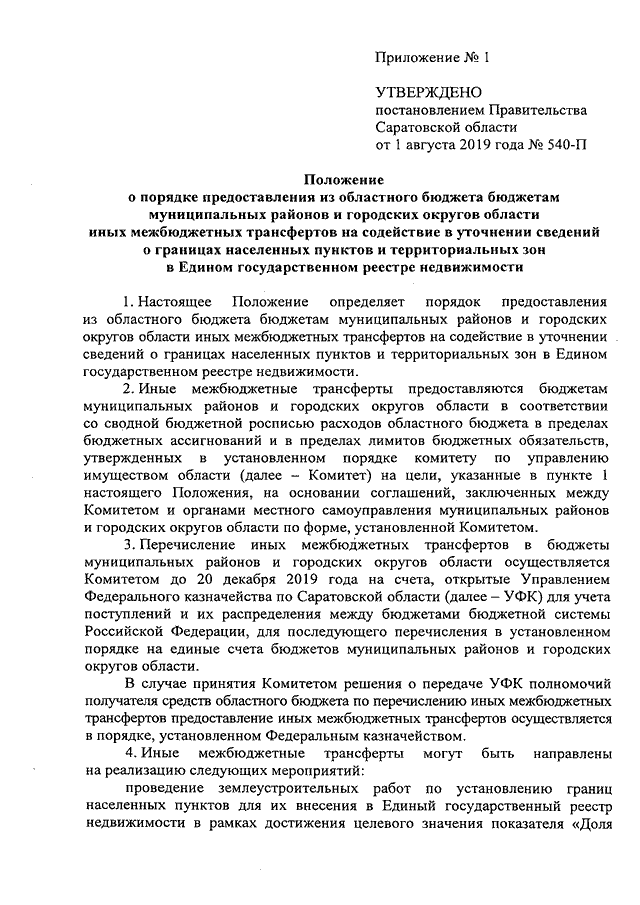 Постановление Правительства Саратовской области от 01.08.2019 N 540-П "О порядке предоставления из областного бюджета бюджетам муниципальных районов и городских округов области иных межбюджетных трансфертов на содействие в уточнении сведений о границах населенных пунктов и территориальных зон в Едином государственном реестре недвижимости" (вместе с "Положением о порядке предоставления из областного бюджета бюджетам муниципальных районов и городских округов области иных межбюджетных трансфертов на содействие в уточнении сведений о границах населенных пунктов и территориальных зон в Едином государственном реестре недвижимости")
