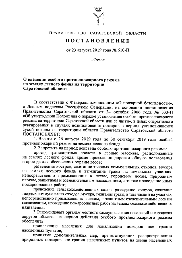 Постановление Правительства Саратовской области от 23.08.2019 N 610-П "О введении особого противопожарного режима на землях лесного фонда на территории Саратовской области"