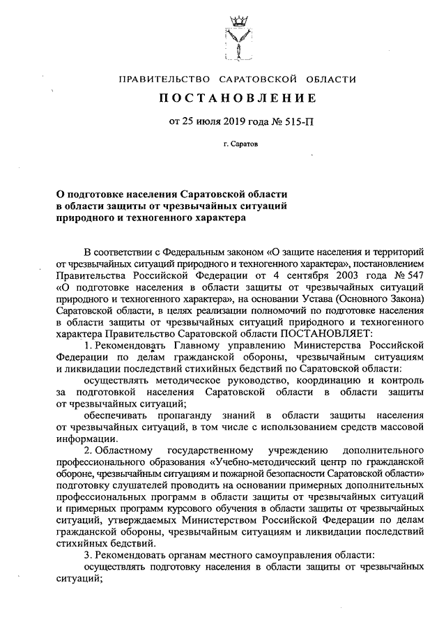 Постановление Правительства Саратовской области от 25.07.2019 N 515-П "О подготовке населения Саратовской области в области защиты от чрезвычайных ситуаций природного и техногенного характера"