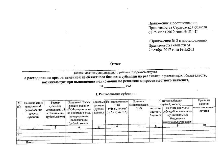 Постановление Правительства Саратовской области от 25.07.2019 N 514-П "О внесении изменений в некоторые постановления Правительства Саратовской области" (вместе с "Отчетом (наименование муниципального района (городского округа) о расходовании предоставленной из областного бюджета субсидии на реализацию расходных обязательств, возникающих при выполнении полномочий по решению вопросов местного значения, за год")