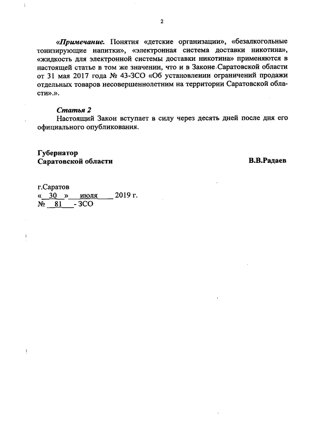 Закон Саратовской области от 30.07.2019 N 81-ЗСО "О внесении изменения в статью 2.5 Закона Саратовской области "Об административных правонарушениях на территории Саратовской области" (принят Саратовской областной Думой 24.07.2019)