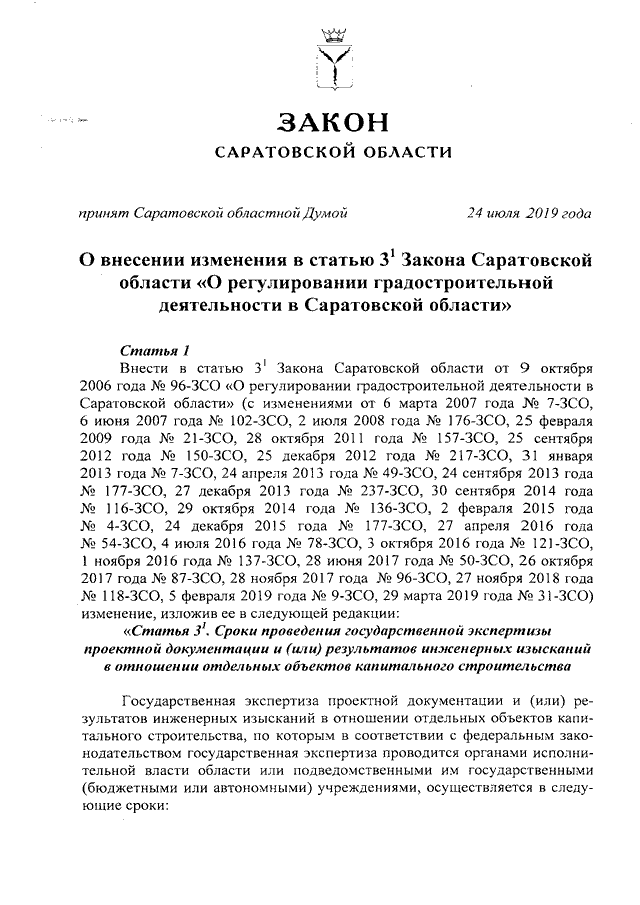 Закон Саратовской области от 30.07.2019 N 80-ЗСО "О внесении изменения в статью 3.1 Закона Саратовской области "О регулировании градостроительной деятельности в Саратовской области" (принят Саратовской областной Думой 24.07.2019)