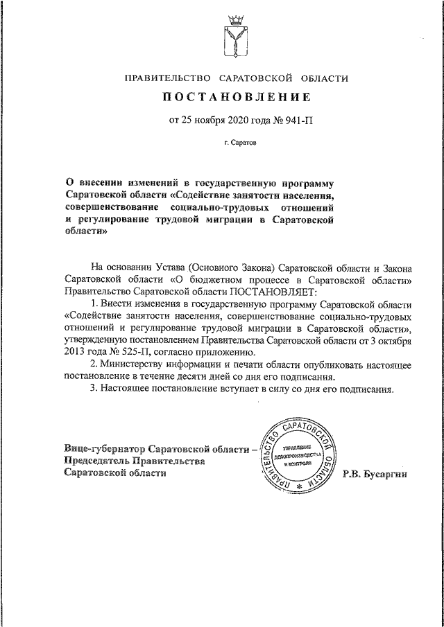 Постановление Правительства Саратовской области от 25.11.2020 N 941-П "О внесении изменений в государственную программу Саратовской области "Содействие занятости населения, совершенствование социально-трудовых отношений и регулирование трудовой миграции в Саратовской области"