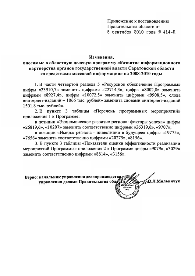Постановление Правительства Саратовской области от 06.09.2010 N 414-П "О внесении изменений в областную целевую программу "Развитие информационного партнерства органов государственной власти Саратовской области со средствами массовой информации" на 2008 - 2010 годы"