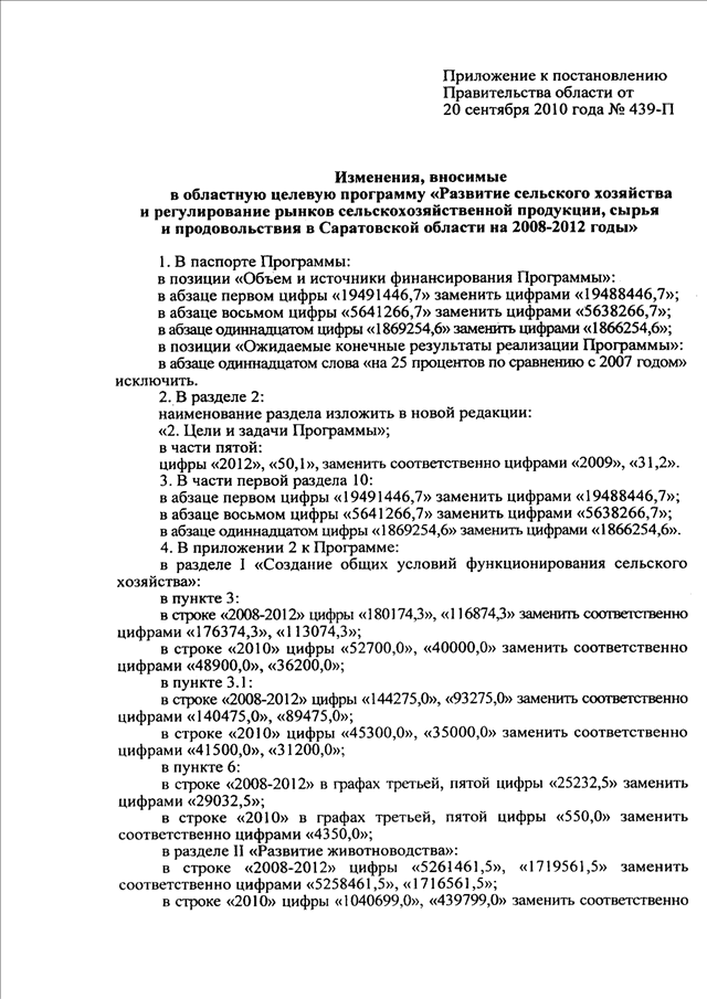 Постановление Правительства Саратовской области от 20.09.2010 N 439-П "О внесении изменений в областную целевую программу "Развитие сельского хозяйства и регулирование рынков сельскохозяйственной продукции, сырья и продовольствия в Саратовской области на 2008 - 2012 годы"